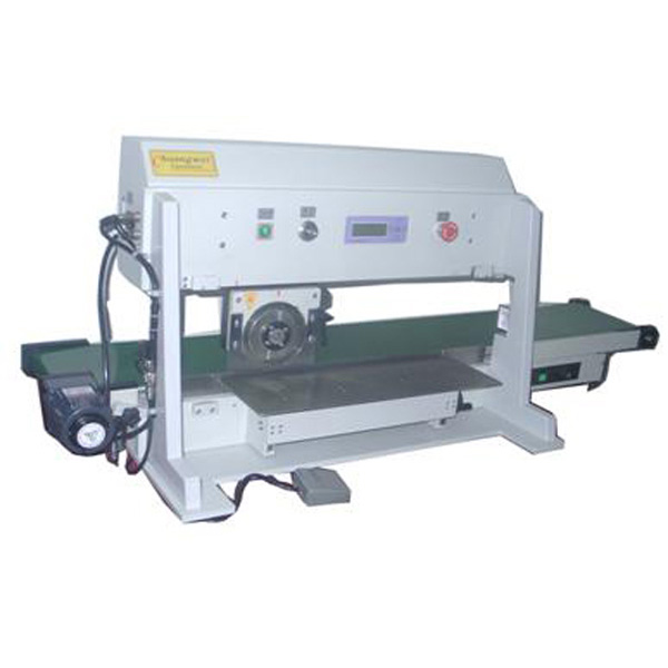 走刀式分板機(jī)一般分為手動和電動兩種,主要是利用上滑軌帶動圓刀移動的原理來進(jìn)行分板操作。對于預(yù)留有V槽的PCB連板,相比之走板式分板機(jī)及鍘刀分板機(jī)來說,電動走刀式分板機(jī)是效率最高的分切設(shè)備。通過PLC控制上圓刀的運(yùn)動速度及行程,可以更高地提升生產(chǎn)效率。隨著科技水平的發(fā)展,自動走刀式分板機(jī)的設(shè)計逐漸變得人性化,有的更是加裝了光電感應(yīng)裝置,當(dāng)有人的手無意伸入分板區(qū)間即自行停機(jī),有效保障了分板機(jī)操作人員的安全。